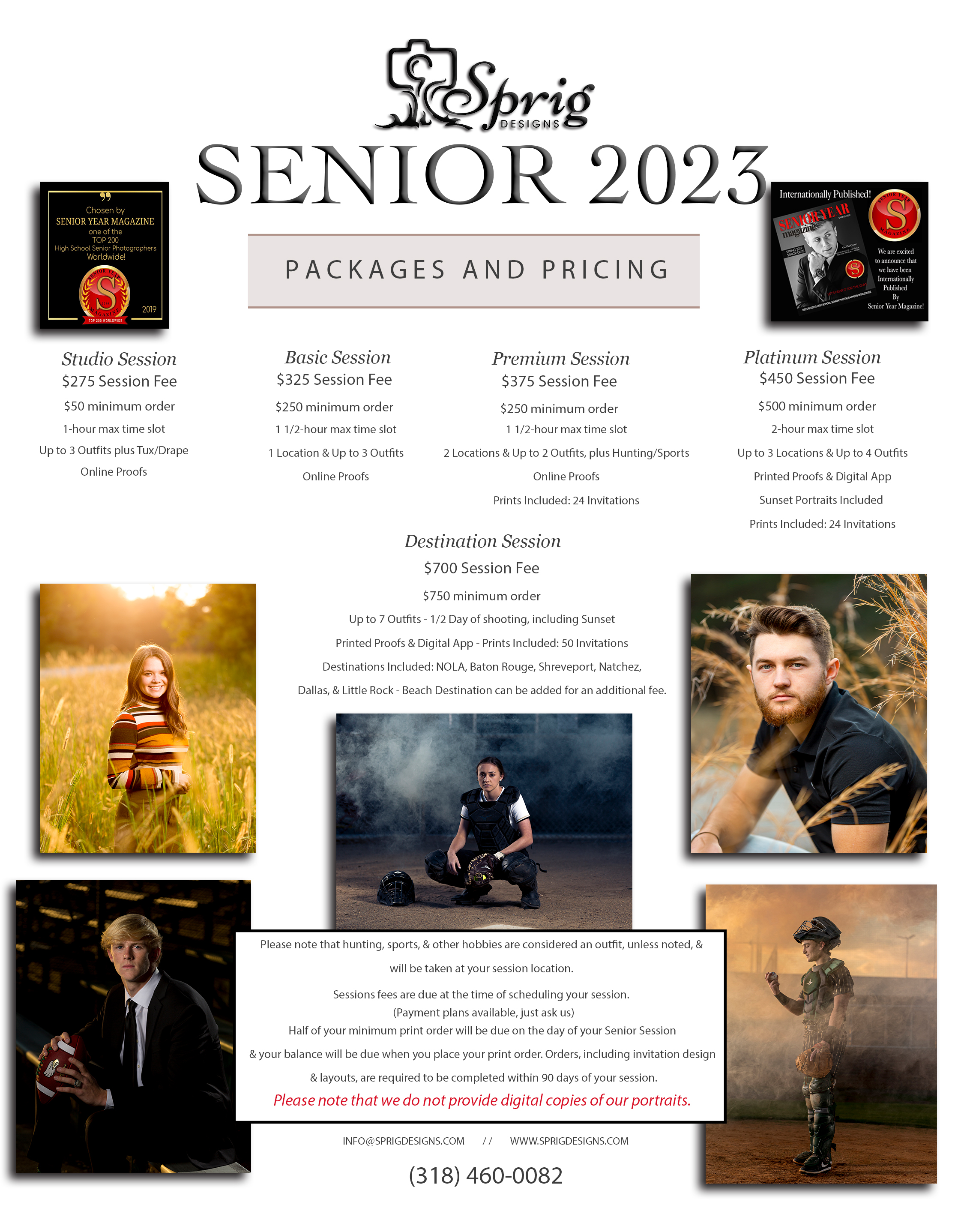 If you are interested in Senior Portraits, please contact us today! info@sprigdesigns.com or call (318) 460-0082.